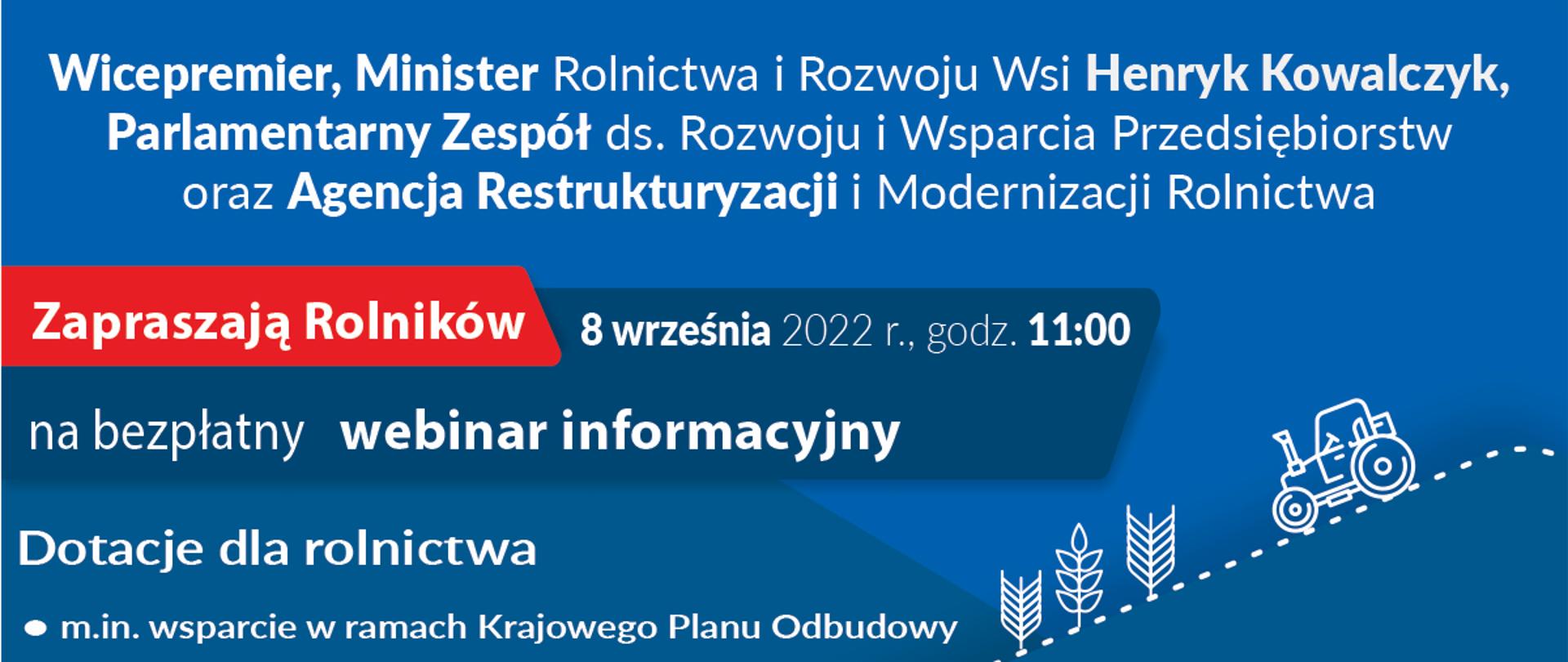 Parlamentarny Zespół ds. Rozwoju i Wsparcia Przedsiębiorstw oraz Agencja Restrukturyzacji i Modernizacji Rolnictwa zapraszają wszystkich zainteresowanych do udziału w internetowym webinarium, które odbędzie się 8 września 2022 r., start o godz. 11. Podczas niego będzie się można dowiedzieć o bieżących działaniach instytucji, które wspierają rolników.