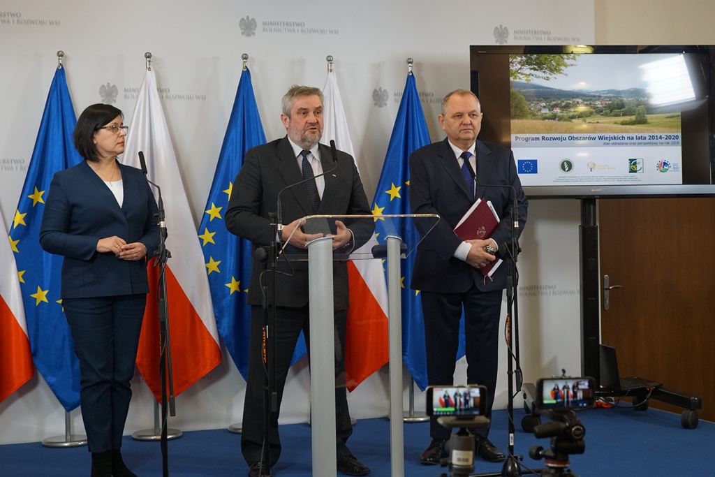 – Obszar finansowania w ramach Programu Rozwoju Obszarów Wiejskich obejmuje praktycznie wszystkie aspekty dotyczące rolnictwa – powiedział minister Jan Krzysztof Ardanowski podczas dzisiejszej konferencji prasowej poświęconej dotychczasowej realizacji Programu i naborom wniosków w bieżącym roku. W spotkaniu z dziennikarzami uczestniczyli również prezes Agencji Restrukturyzacji i Modernizacji Rolnictwa Maria Fajger oraz podsekretarz stanu Ryszard Zarudzki. Minister Ardanowski zapewnił, że nie stracimy żadnych pieniędzy, które są dostępne w ramach PROW 2014-2020 i dodał, że najważniejsze jest ich efektywne wydatkowanie. – Nie tylko jest ważne wydawanie, ale ważniejsze jest jeszcze wydawanie „z głową” – podkreślił. – Wszystko to co będzie możliwe do uproszczenia zostanie uproszczone, chociaż wprowadzanie zmian w PROW nie jest łatwe i wymaga notyfikacji w Komisji Europejskiej – zaznaczył szef resortu rolnictwa i dodał, że bieżąca analiza realizacji Programu jest bazą do wprowadzania modyfikacji oraz negocjacji w zakresie nowego WPR. – Istotne jest, aby inwestowanie przynosiło wartość dodaną– zwrócił uwagę minister Ardanowski. Podsekretarz stanu Ryszard Zarudzki szczegółowo przedstawił stan realizacji poszczególnych działań oraz harmonogram naboru kolejnych wniosków w roku 2019. –Do końca 2018 roku na kontach beneficjentów znalazło się 16,5 mld złotych, czyli ponad 28% dostępnej puli środków –poinformował wiceminister. Od początku realizacji do końca 2018 roku zostało złożonych łącznie około 3,5 mln wniosków o przyznanie pomocy. A ich wartość wynosi 40,5 mld złotych, co stanowi ponad 69% całkowitego budżetu Programu. Ogólny poziom kontraktacji wynosi ponad 46 % dostępnego budżetu. Podsekretarz stanu zwrócił uwagę, że głównymi celami PROW 2014-2020 są: wzrost konkurencyjności polskiego rolnictwa oraz zadania środowiskowe i klimatyczne. –Analizując stan realizacji Programu należy pamiętać o formule n+3, a to oznacza, że środki muszą być wydatkowane do roku 2023 – podkreślił wiceminister Zarudzki. Prezes ARiMR Maria Fajger zwróciła uwagę, że kierowana przez nią instytucja jest największą agencją płatniczą w Unii Europejskiej. – Jesteśmy agencją płatniczą za pośrednictwem której dystrybuowane są do beneficjentów środki unijne oraz krajowe, a miniony rok był szczególnie trudny ze względu na bardzo wiele realizowanych działań – podkreśliła prezes. – Niezwykle istotna jest determinacja w realizacji zasady n+3, gdyż ile środków nie zostanie w tej formule zrealizowanych, tyle nam przepadnie – przypomniała szefowa ARiMR. – Spełniliśmy tę zasadę z naddatkiem – poinformowała prezes Maria Fajger i dodała, że nie oznacza to spowolnienie w tym roku działań Agencji, a wręcz przeciwnie przyspieszenie ich. Minister Ardanowski powiedział, że pomimo trudności ARiMR dobrze realizowała swoje zadania i wskazał na wypłatę zaliczek płatności bezpośrednich oraz realizację pomocy suszowej.