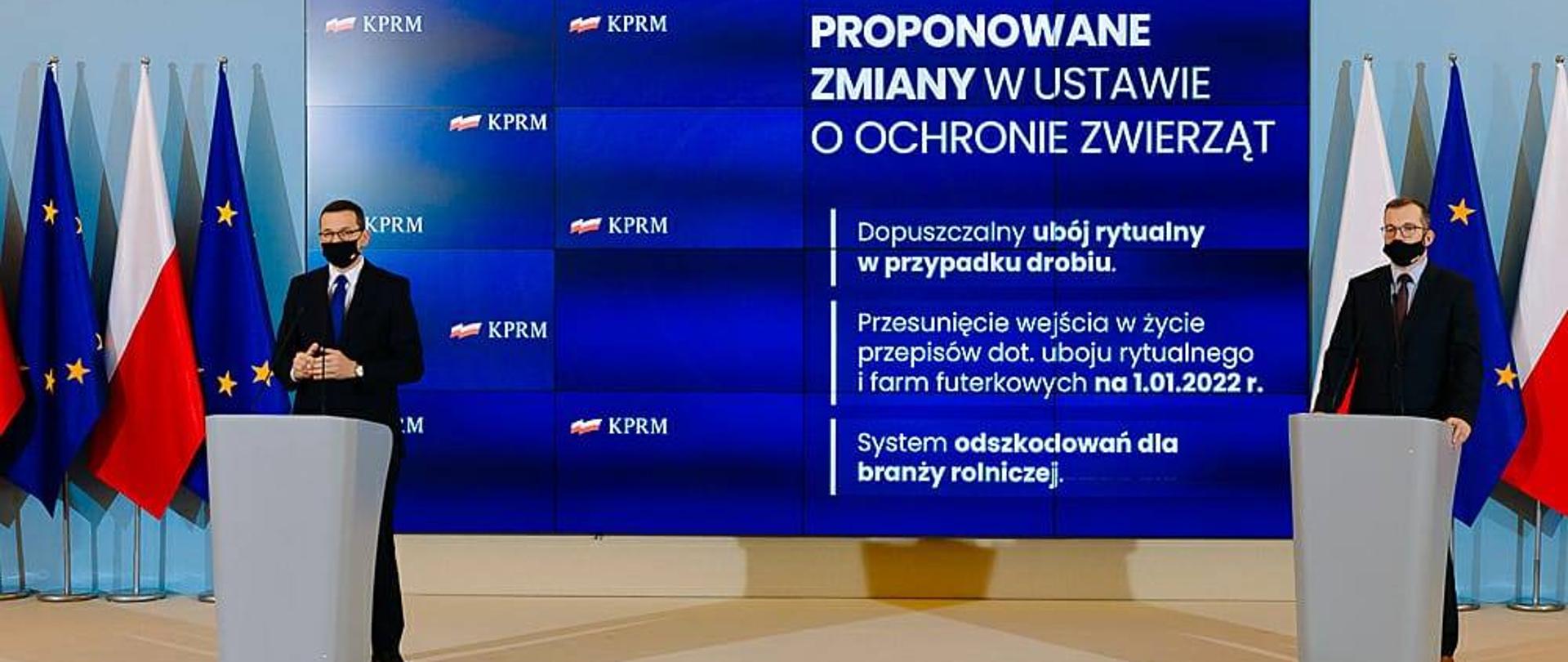 Premier Mateusz Morawiecki i minister rolnictwa i rozwoju wsi Grzegorz Puda przedstawili podczas konferencji prasowej zmiany proponowane w ustawie o ochronie zwierząt: