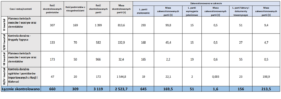 Podejrzenie nieprawidłowości zostało potwierdzone w 42% spośród skontrolowanych podmiotów. Pod kątem prawidłowości znakowania oraz wymagań jakościowych zakwestionowano wówczas 65 partii świeżych ogórków i pomidorów o masie 111 t.