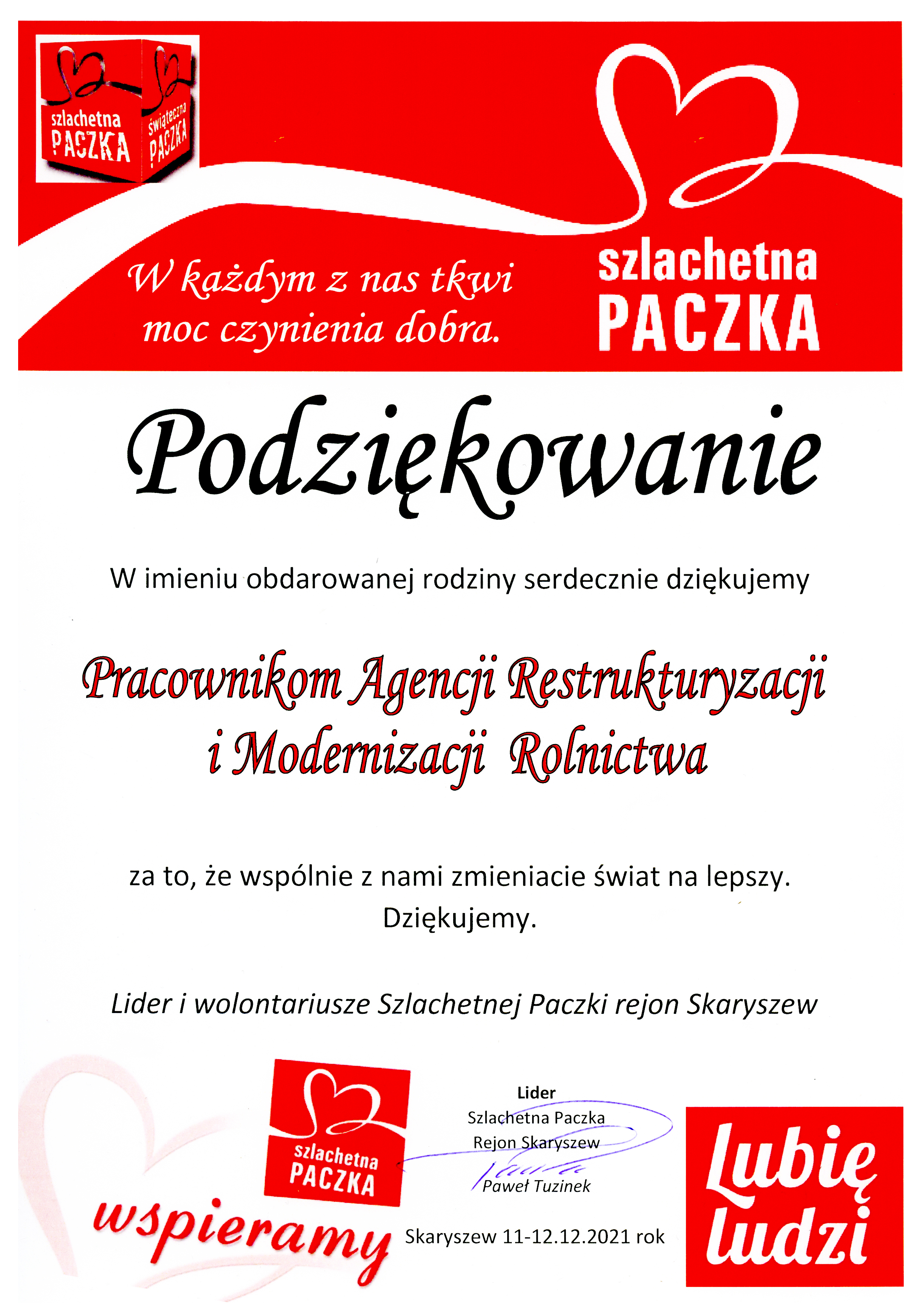 Pracownicy Centrali Agencji Restrukturyzacji i Modernizacji Rolnictwa po raz pierwszy włączyli się w akcję „Szlachetna Paczka”. Fundusze zbieraliśmy od 19 listopada do 3 grudnia 2021 r. Za zebrane pieniądze kupiono sześcioosobowej rodzinie z południowego Mazowsza najpotrzebniejsze rzeczy, m.in. kuchenkę gazową, drobne AGD, odzież, artykuły spożywcze i środki czystości. Całość została spakowana i dostarczona do siedziby Ochotniczej Straży Pożarnej w Skaryszewie w sobotę 11 grudnia przed południem. Przekazaniem naszej „Szlachetnej Paczki” rodzinie zajęli się wolontariusze i druhowie z OSP.