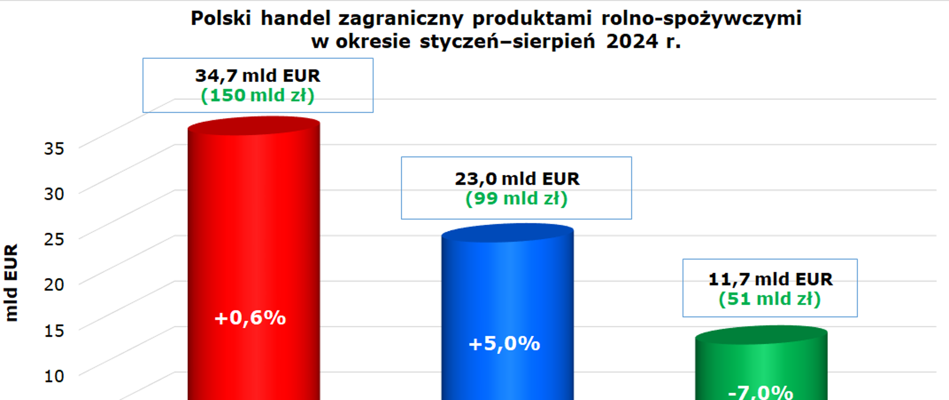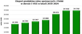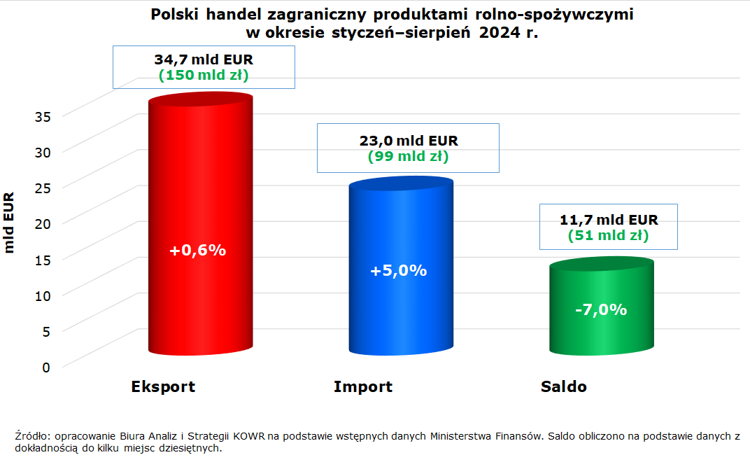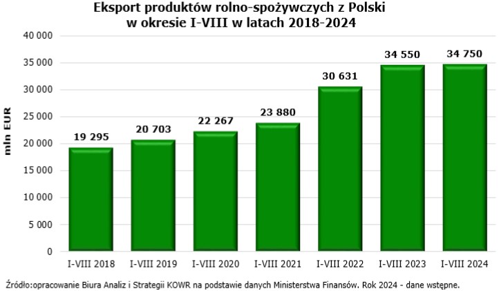 W okresie od stycznia do sierpnia 2024 r. wartość eksportu towarów rolno-spożywczych z Polski wyniosła 34,75 mld EUR (150,1 mld zł) i była wyższa o 0,2 mld EUR w stosunku do analogicznego okresu 2023 r.