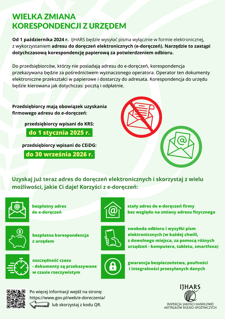 Od 1 października 2024 r. IJHARS będzie wysyłać pisma wyłącznie w formie elektronicznej, z wykorzystaniem adresu do doręczeń elektronicznych (e-doręczeń). Narzędzie to zastąpi dotychczasową korespondencję papierową za potwierdzeniem odbioru.